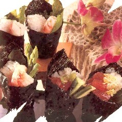 2.手沾醋水將壽司飯捏成橢圓形後海苔從外邊圍起,然後鑲入15公克之銀魚,以鮭魚卵裝飾即可,食用時沾芥末及醬油。